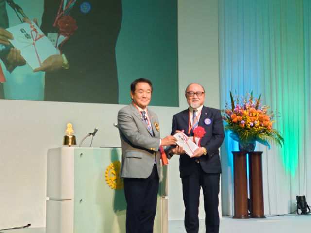 水戸RCでは、昨年度の功績をたたへ、大髙ガバナーより、直前大久保ガバナー、髙原地区幹事、増山地区会計長へ記念品の贈呈がありました。